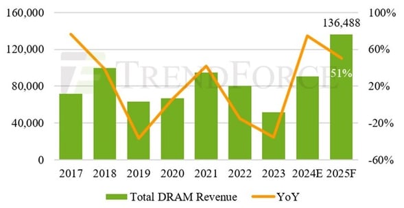 Выручка мировых поставщиков DRAM всех типов по годам, столбцы, млн долл. США, и её годовая динамика, линия, правая шкала: до 2023 г. включительно — статистические данные, на 2024 г. — оценка, на 2025 г. — прогноз