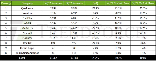 В самом конце апреля аналитики TrendForce завершили подсчёт выручки крупнейших 10 разработчиков чипов в мире — от Qualcomm с рыночной долей (в денежном выражении) более 23% до Will Semiconductor с 1,6% — за IV кв. 2022 г. Выяснилось, что суммарное воздействие целого ряда негативных факторов — продолжавшейся во второй половине прошлого года оптимизации накопленных на складах запасов СБИС, резко выросшей по всему миру инфляции, удорожания кредитов, ослабления потребительского спроса, введения США рестрикций против ИТ-отрасли КНР и т. п. — привели к значительному, на 9,2% квартал к кварталу, снижению совокупного объёма полученных этими компаниями от заказчиков денежных средств.