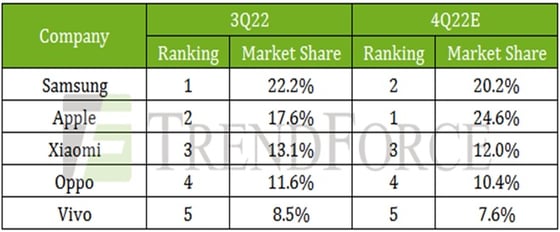 Аналитики TrendForce зафиксировали в III кв. 2022 г. аномалию на мировом рынке смартфонов. По их оценкам, отгрузки смартфонов в мире за III кв. 2022 г. составили 289 млн единиц, что на 0,9% меньше, чем за II квартал года.