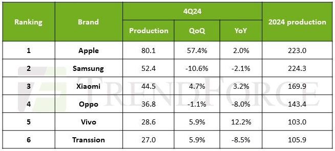 Число смартфонов, выпущенных ODM-партнёрами для ведущих шести мировых компаний в этом сегменте, за IV кв. и за весь 2024 г., млн единиц, а также динамика этого выпуска за последние три месяца года в квартальном и годовом выражении, %