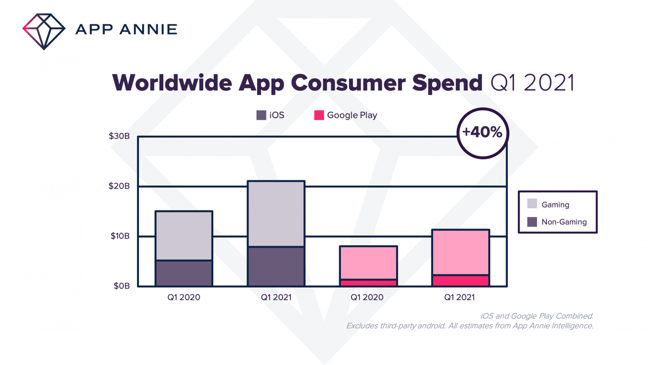 За первый квартал 2021 года пользователи потратили в мобильных приложениях на 40% больше, чем в прошлом году