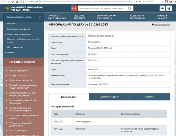 «В удовлетворении ходатайства следователя об избрании меры пресечения в виде заключения под стражу в отношении Паршина Максима Викторовича, обвиняемого в совершении преступления, предусмотренного ч. 6 ст. 290 УК РФ», – говорится в официальном заявлении пресс-службы суда.